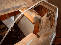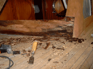 Typisches Schadensbild bei Booten aus Sperrholz. Faulung unter der Oberfläche.